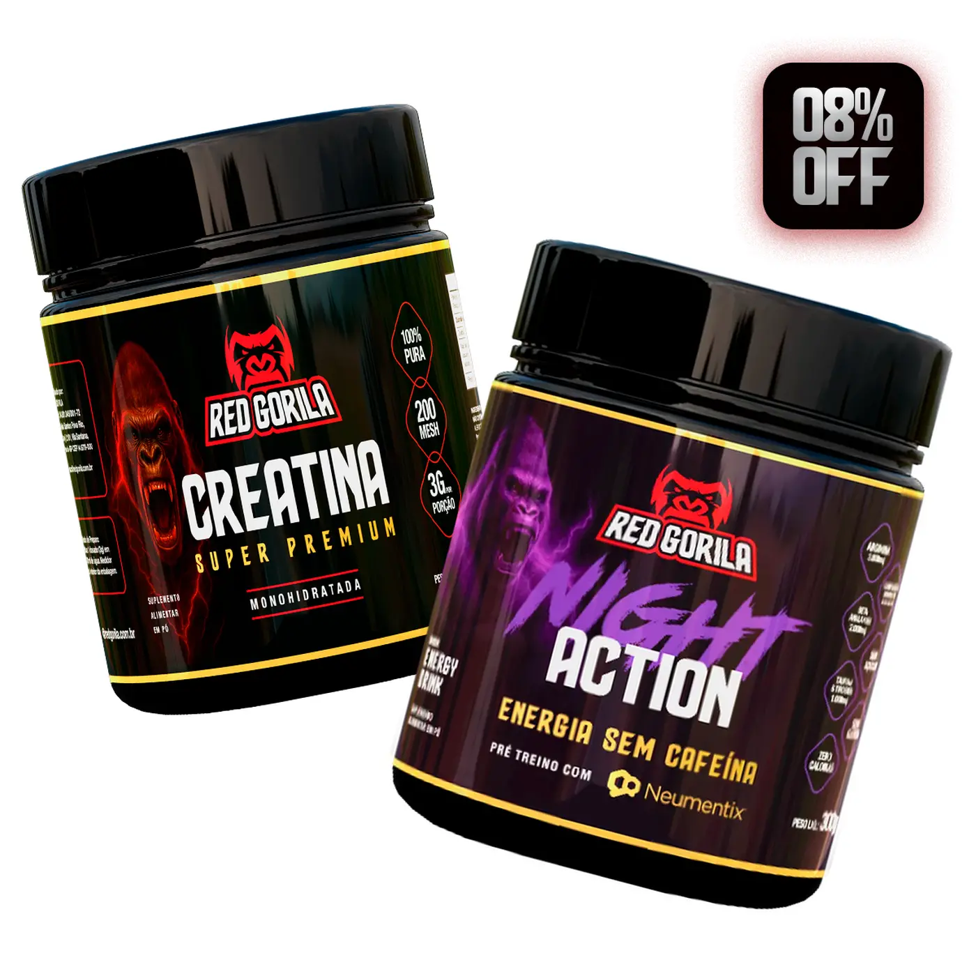 Kit Night Action 300g (sem cafeína) + Creatina Super Premium 300g Red Gorila, performance noturna + força diária.